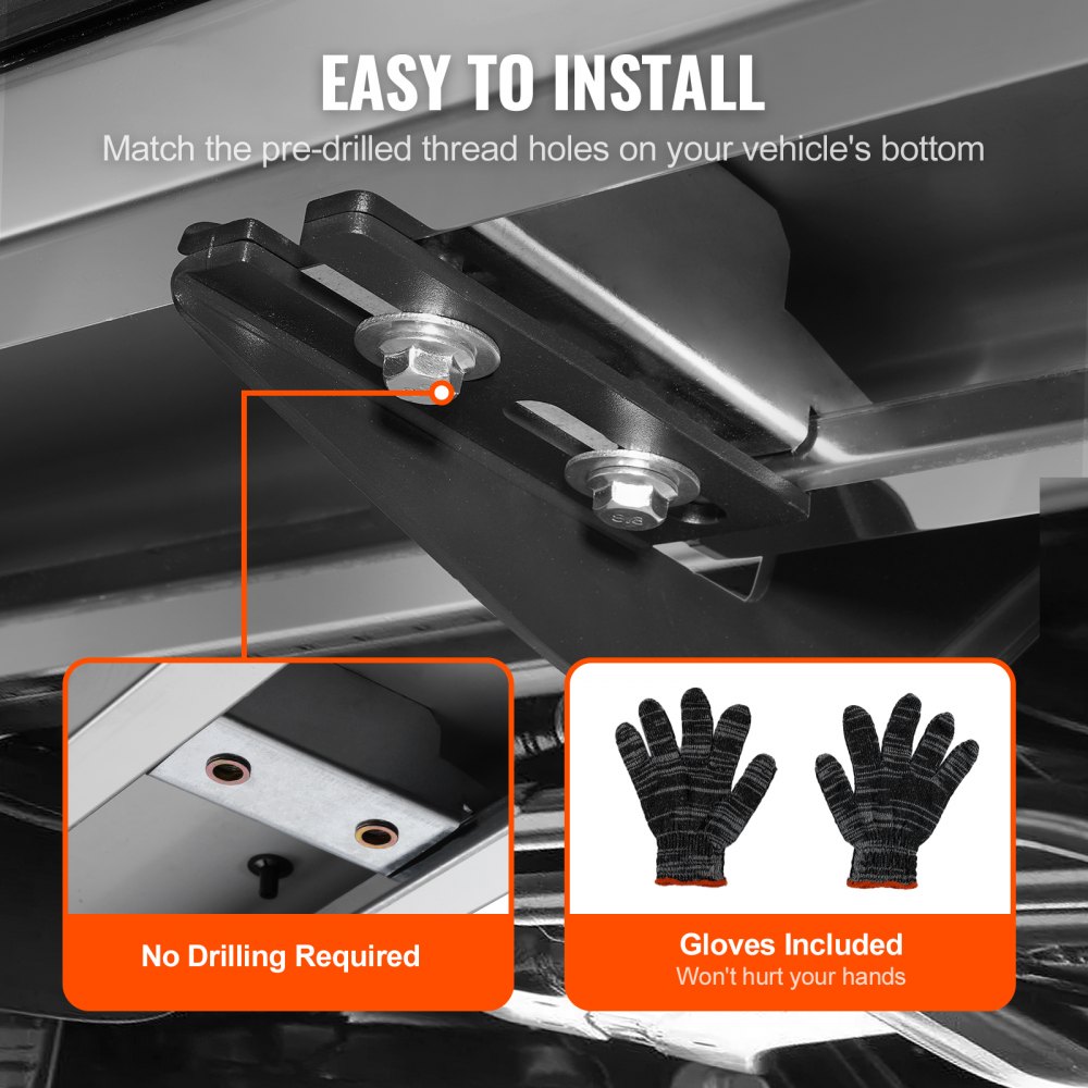Bezproblemowy montaż: Te podnóżki do ciężarówek zostały zaprojektowane z myślą o łatwym montażu w wybranych modelach i wymagają jedynie śrub, podkładek i nakrętek, bez konieczności wiercenia. Konstrukcja zapobiegająca zarysowaniom zapobiega zarysowaniom, a dołączone rękawice zapewniają ochronę dłoni podczas montażu. UWAGA: Nie nadaje się do wszystkich modeli z silnikiem Diesla.