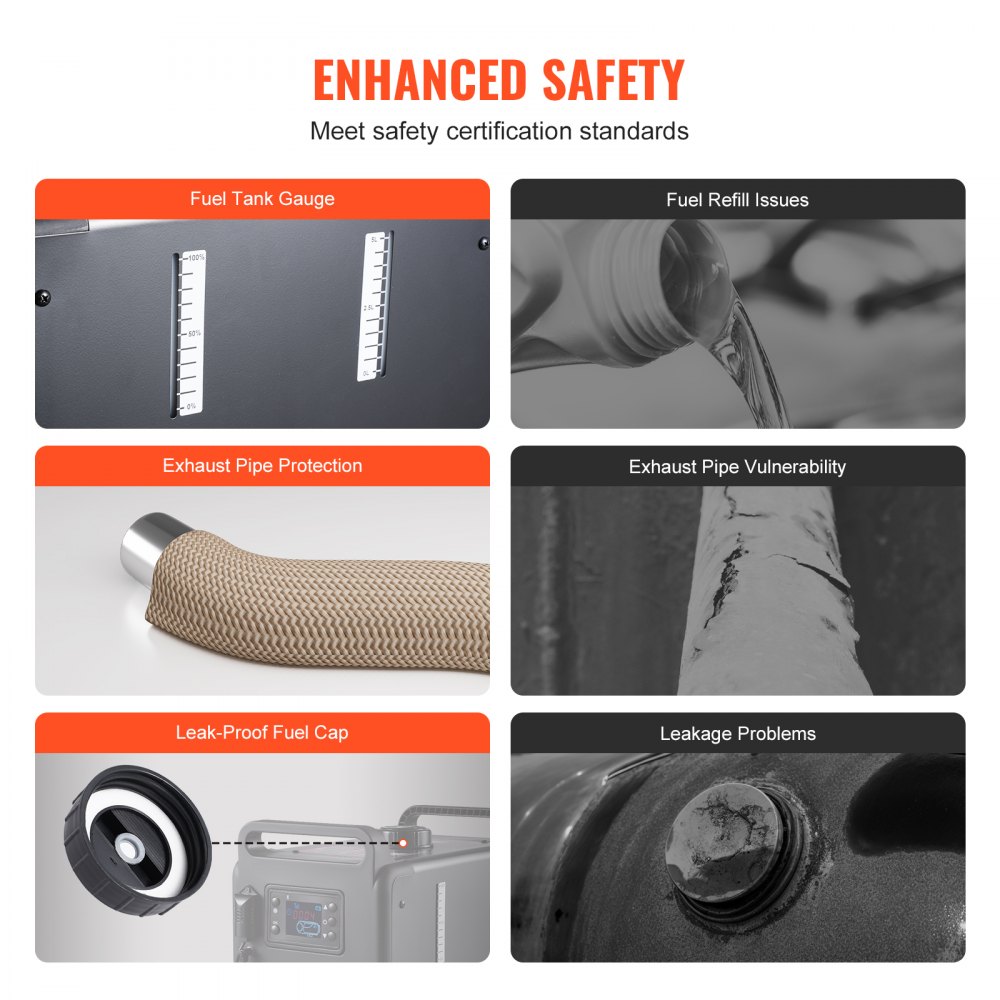 Innowacyjny system alarmowy CO: Nasz piec na olej napędowy zapewnia większe bezpieczeństwo dzięki wbudowanemu alarmowi CO, który stale monitoruje poziom CO i generuje alerty lub automatycznie wyłącza się w razie potrzeby. Inne udoskonalenia obejmują szczelny korek wlewu paliwa, wskaźnik poziomu paliwa oraz zabezpieczenie przed przegrzaniem, zapewniające spokój ducha podczas długotrwałego użytkowania.