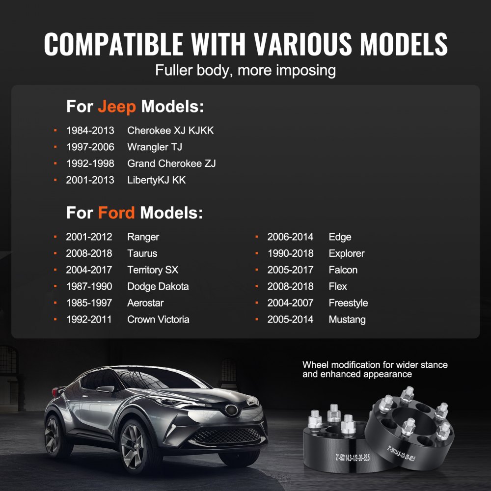 Szeroka kompatybilność: Te dystanse do kół są kompatybilne z wieloma pojazdami Jeep i Ford z lat 1984–2018, w tym: Jeep: 1984–2013 Cherokee XJ KJ KK, 1997–2006 Wrangler TJ, 1992–1998 Grand Cherokee ZJ, 2001–2013 Liberty KJ KK. Ford: Ranger 2001-2012, Taurus 2008-2018, Territory SX 2004-2017, Dodge Dakota 1987-1990, Aerostar 1985-1997, Crown Victoria 1992-2011, Edge 2006-2014, Explorer 1990-2018, Falcon 2005-2017, Flex 2008-2018, Freestyle 2004-2007, Mustang 2005-2014.