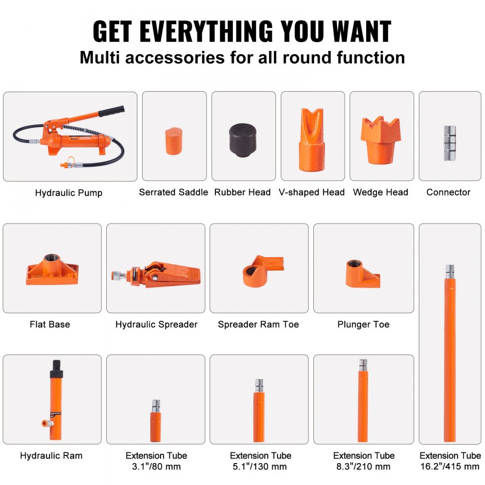 Idealny do wszelkich potrzeb: Ten przenośny zestaw siłowników hydraulicznych zawiera wszystko, czego potrzebujesz do naprawy! W jego skład wchodzi pompa hydrauliczna, siłownik hydrauliczny, cztery rury przedłużające, siodło zębate, głowica gumowa, głowica V, głowica klinowa, złącze, płaska podstawa, rozpieracz hydrauliczny, końcówka rozpieracza i końcówka tłokowa. Z łatwością poradzisz sobie z każdym projektem.