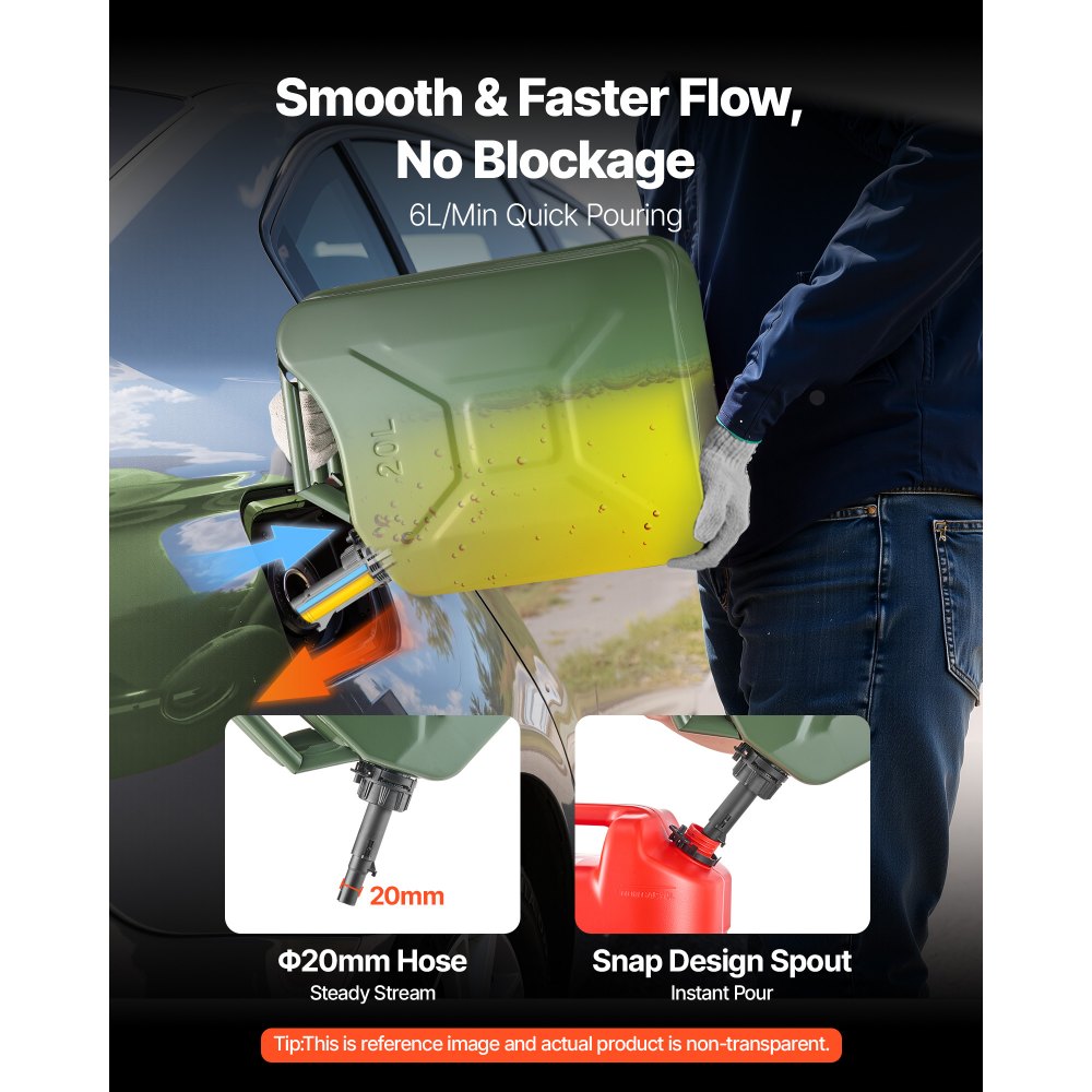 Stały, szybki przepływ 6 l/min: Nie znosisz powolnego i brudzącego napełniania? Ten metalowy pojemnik zapewnia do 6 l/min dzięki szerokiemu wężowi o średnicy 20 mm i zatrzaskowemu dzióbkowi, co pozwala na płynne nalewanie bez rozpryskiwania i irytującego bulgotania.