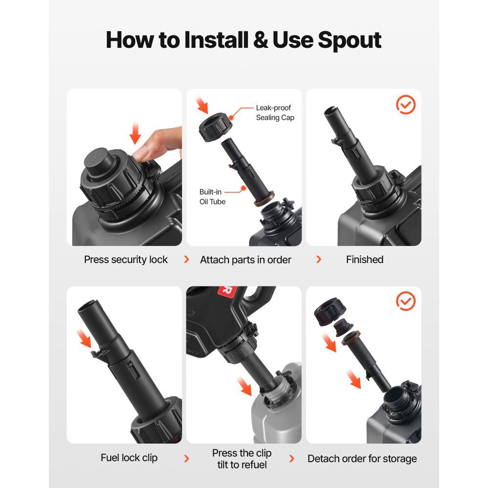 Bezpieczne zamknięcie zapobiegające poluzowaniu: Martwisz się o przecieki na wyboistych drogach? Bez obaw! Ten kanister na benzynę ma szczelną pokrywkę, klips mocujący i zintegrowaną rurkę, dzięki czemu jest zawsze szczelny.