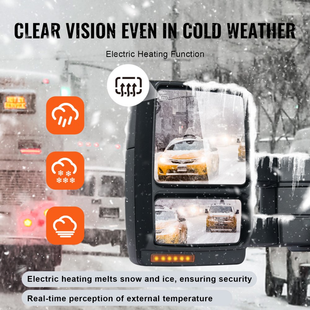 Lusterka holownicze VEVOR, para lewego i prawego do Forda F150 2004-2014, podgrzewane elektrycznie, z kierunkowskazami i oświetleniem podwozia, płaskie i wypukłe szkło, ręcznie sterowany system składania teleskopowego, ogrzewanie i odmrażanie, czarne