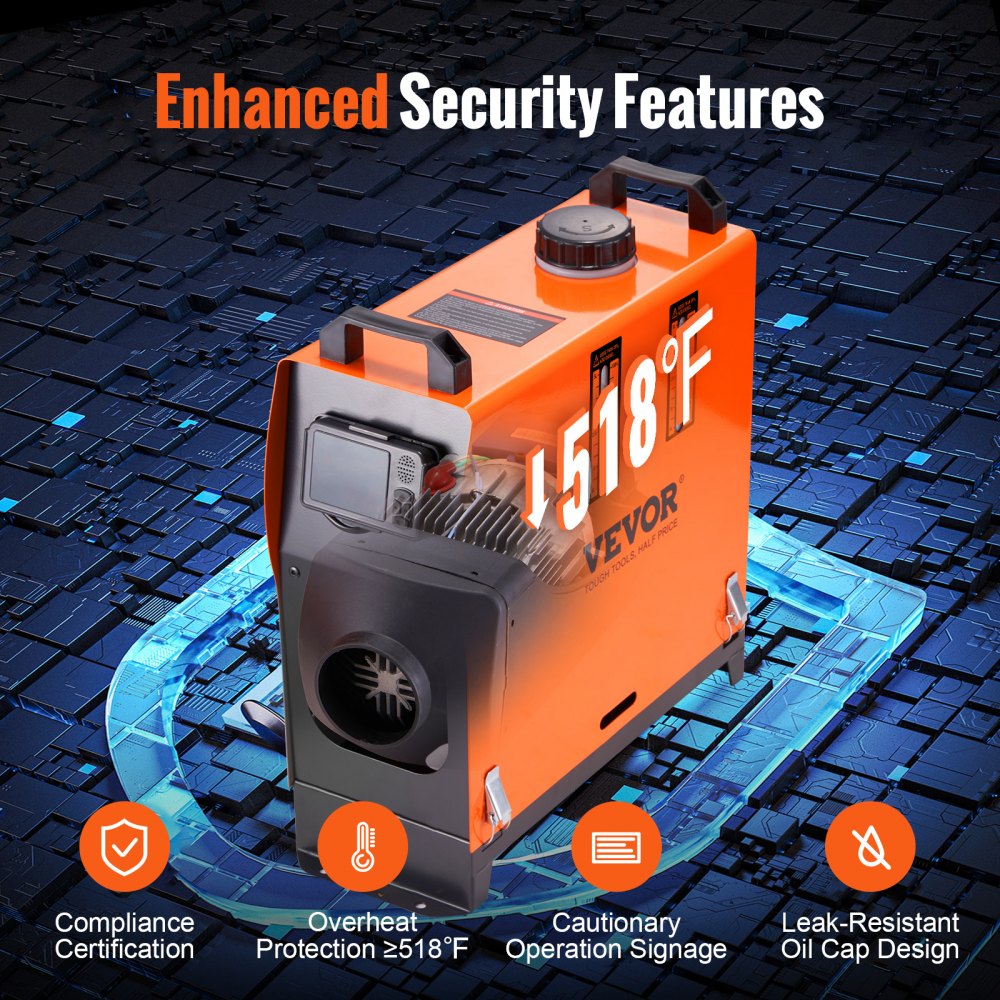 Bezpieczny i niezawodny: Nasz ogrzewacz dieslowy 12 V jest wyposażony w zaawansowany system bezpieczeństwa, który umożliwia bezproblemową pracę w różnych warunkach, takich jak samochody, kampery i łodzie. Oferuje on stałą kontrolę temperatury, funkcję timera, transmisję głosu, podgrzewanie wstępne i zabezpieczenie przed przegrzaniem do ≥ 270°C (518°F), zapewniając bezpieczeństwo i komfort przez całą noc.