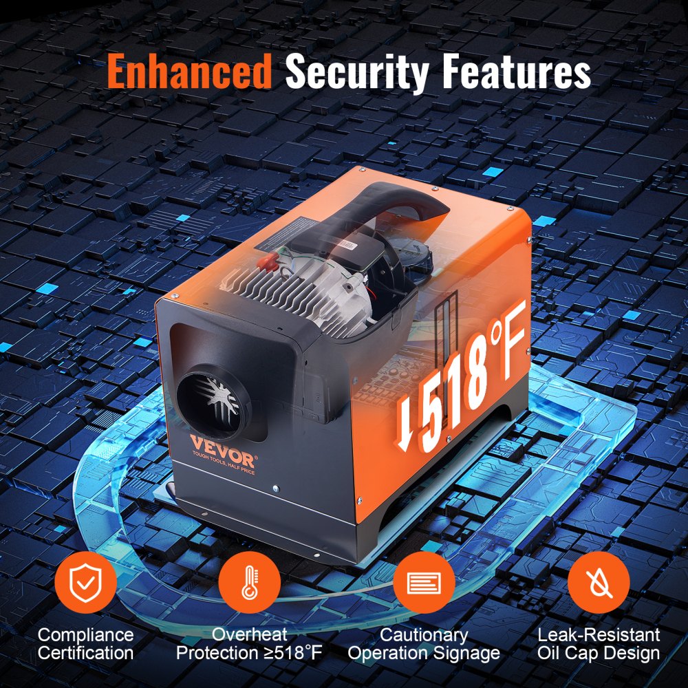 Bezpieczny i niezawodny: Nasz podgrzewacz powietrza na olej napędowy jest wyposażony w system wysokiego poziomu bezpieczeństwa, który pozwala na bezproblemowe użytkowanie w różnych warunkach, takich jak samochody, kampery i łodzie. Oferuje on stałą kontrolę temperatury, funkcję timera, sterowanie głosowe, podgrzewanie wstępne i zabezpieczenie przed przegrzaniem powyżej 270°C (518°F), zapewniając bezpieczeństwo i komfort przez całą noc.