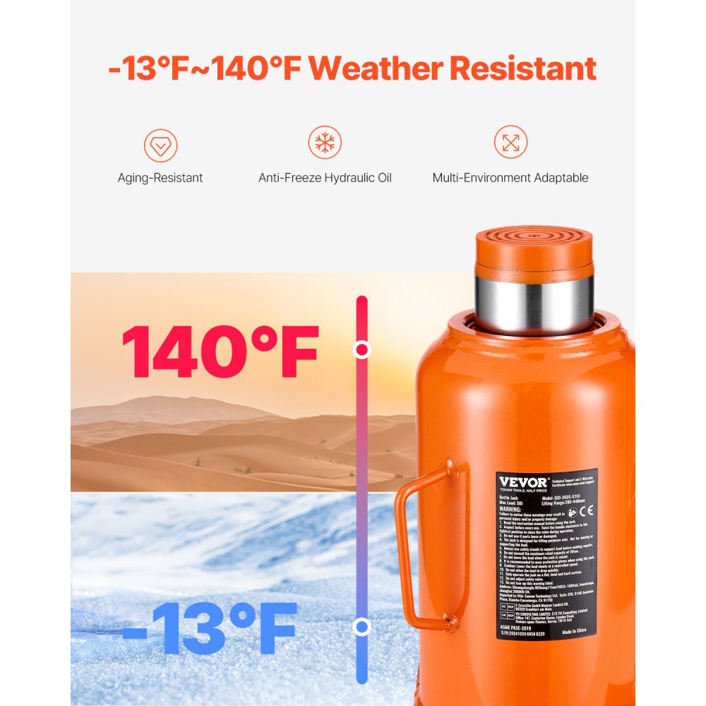 Konstrukcja odporna na przecieki: Ten podnośnik hydrauliczny charakteryzuje się precyzyjnymi spawami przemysłowymi i uszczelnionymi połączeniami, które zapobiegają przeciekom. Jest przeznaczony do pracy w każdych warunkach pogodowych w zakresie temperatur od -13 do 140°F (25 do 60°C), co zapewnia niezawodną pracę i zmniejsza ryzyko zużycia części oraz zamarzania oleju hydraulicznego.