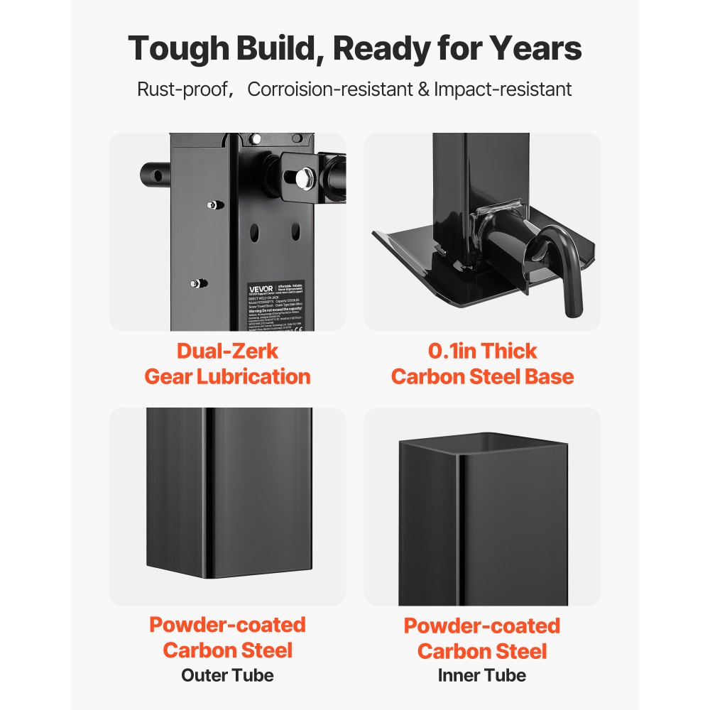 Zaprojektowany do trudnych warunków: Podnośnik przyczepowy wykonany jest ze wzmocnionej rury stalowej malowanej proszkowo oraz podstawy ze stali węglowej o grubości 0,17 cala/4,3 mm, co zapewnia odporność na wyginanie, odkształcenia i zużycie z biegiem czasu.