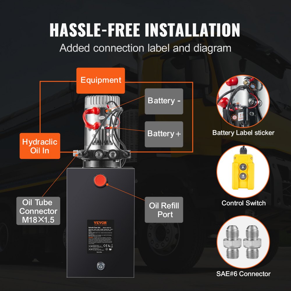 Łatwy montaż: Pompa hydrauliczna 12 V jest dostarczana w stanie zmontowanym. Wystarczy napełnić ją olejem hydraulicznym, podłączyć zasilanie i węże i gotowe. Pompa hydrauliczna VEVOR jest wyposażona w konwerter SAE nr 6, dzięki czemu jest kompatybilna zarówno z interfejsami metrycznymi, jak i amerykańskimi.