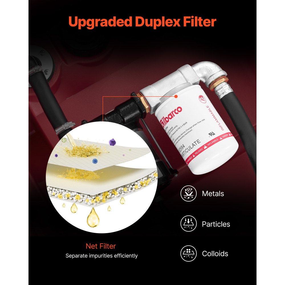 Ulepszona konstrukcja filtra: W porównaniu do innych produktów, nasz zbiornik do transferu paliwa jest wyposażony w filtr dupleksowy, który zapewnia czystszy olej napędowy. Przedni filtr wewnętrznego zbiornika może wychwytywać duże cząsteczki brudu, podczas gdy wysokiej jakości filtr zewnętrzny filtruje małe zanieczyszczenia, takie jak metale, koloidy, drobne cząsteczki itp.