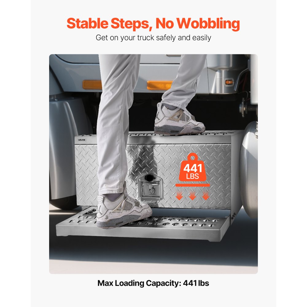 Stabilne stopnie, brak chwiania się: Ta solidna skrzynia narzędziowa wykonana z aluminiowych płyt diamentowych składa się z płyt stopniowych o grubości 2 mm i korpusu o grubości 3 mm. Oferuje solidną konstrukcję i udźwig do 200 kg, umożliwiając kierowcom bezpieczne i stabilne wsiadanie i wysiadanie z pojazdów.