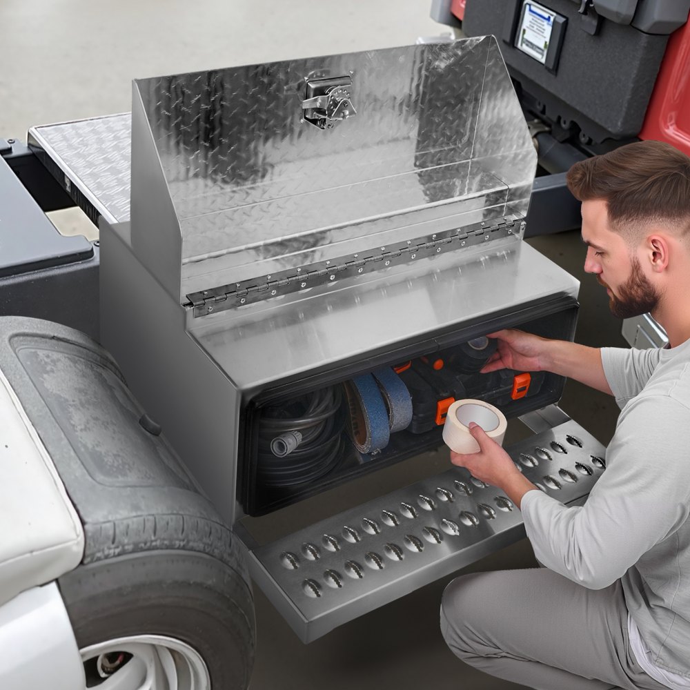 Skrzynka narzędziowa VEVOR, 760x750x400 mm, aluminiowa, do przechowywania stopni wejściowych do kabiny kierowcy z uchwytem w kształcie litery T, zamkiem i kluczami do ciężarówek z platformą, dźwigów i naczep
