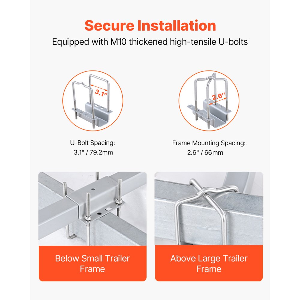 Dwie metody montażu: Śruby w kształcie litery U umożliwiają elastyczne mocowanie do przyczep o szerokości do 76,2 mm (3 cale). Te dwie metody montażu są odpowiednie dla różnych modeli przyczep, w tym przyczep do łodzi narciarskich i przyczep do łodzi wędkarskich. Nawet mniejsze przyczepy ramowe można bezpiecznie zamontować. Ulepszona, pogrubiona stal o wysokiej wytrzymałości M8 zapewnia solidny i stabilny montaż bez nadmiernych ruchów i odkształceń.