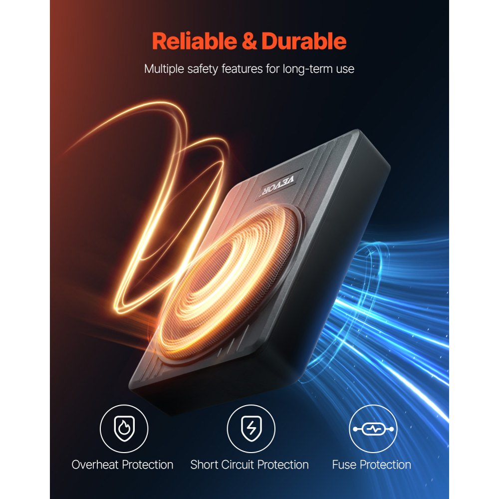 Wielofunkcyjna ochrona: Ten aktywny subwoofer samochodowy jest wyposażony w liczne wbudowane zabezpieczenia, w tym zabezpieczenie przed przegrzaniem, zwarciem i bezpiecznikiem, co zapewnia niezawodną i długotrwałą pracę. Obudowa ze stopu aluminium poprawia odprowadzanie ciepła, zapobiegając przegrzaniu i znacznie wydłużając żywotność subwoofera.