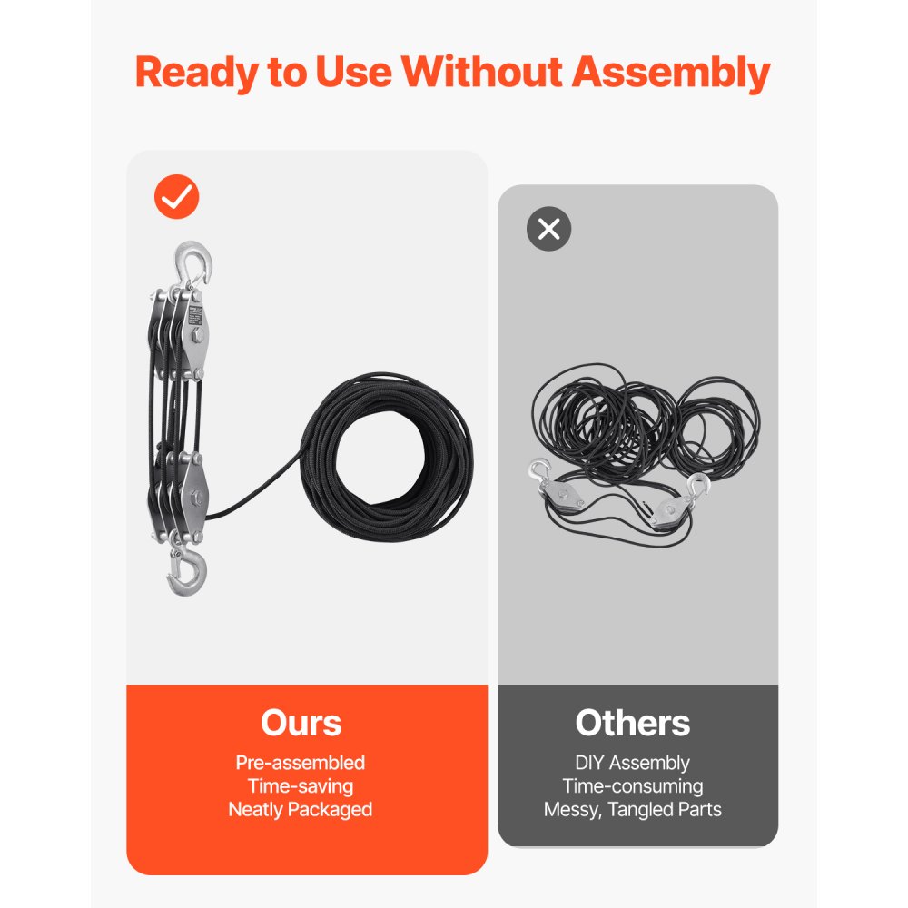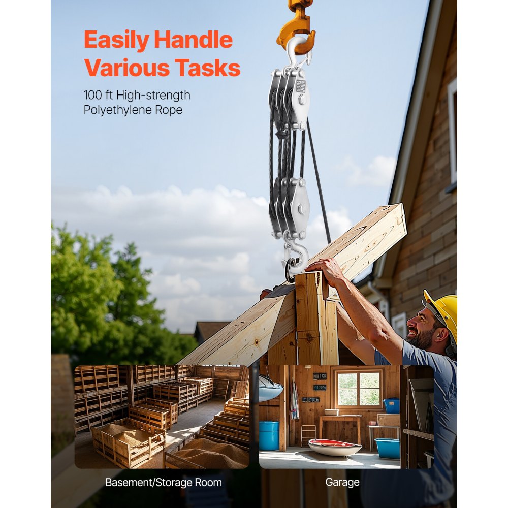 Wytrzymały udźwig: Każdy podnośnik wyposażony jest w trzy metalowe krążki i mocną linę o udźwigu do 2 ton. Dzięki zalecanemu udźwigowi roboczemu 500 kg z łatwością poradzisz sobie z ciężkimi zadaniami, takimi jak podnoszenie zwierząt, drzew, mebli, rowerów, motocykli i skrzynek narzędziowych. Przetestowany pod kątem niezawodności, to Twój pierwszy wybór, jeśli chodzi o podnoszenie bez wysiłku.