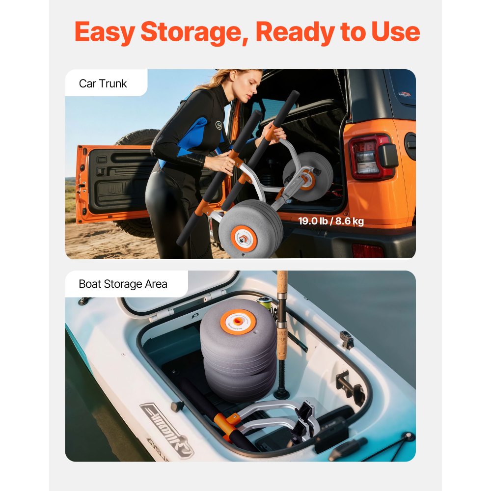 Składany i kompaktowy: Lekka, odpinana konstrukcja pozwala na łatwy transport jedną ręką. Wózek do paddleboardu zmieści się wygodnie w bagażniku SUV-a lub w schowku na łodzi, dzięki czemu idealnie nadaje się do łatwego transportu lub szybkiego przechowywania, gdy nie jest używany.