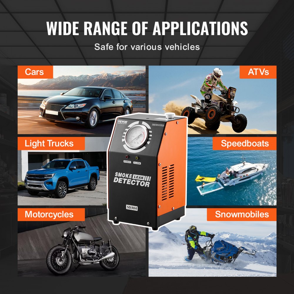 Wszechstronny tester, jedno narzędzie do wszystkiego: samochodowy wykrywacz nieszczelności VEVOR idealnie nadaje się do szerokiej gamy testów, takich jak układy EVAP, zbiorniki paliwa, układy wydechowe, układy dolotowe, sprawdzanie szczelności w samochodach oraz wykrywanie różnych problemów z nieszczelnością połączeń rurowych. Idealny do samochodów, motocykli, pojazdów terenowych, lekkich ciężarówek i łodzi motorowych. Kompletne rozwiązanie do kompleksowej diagnostyki pojazdów.