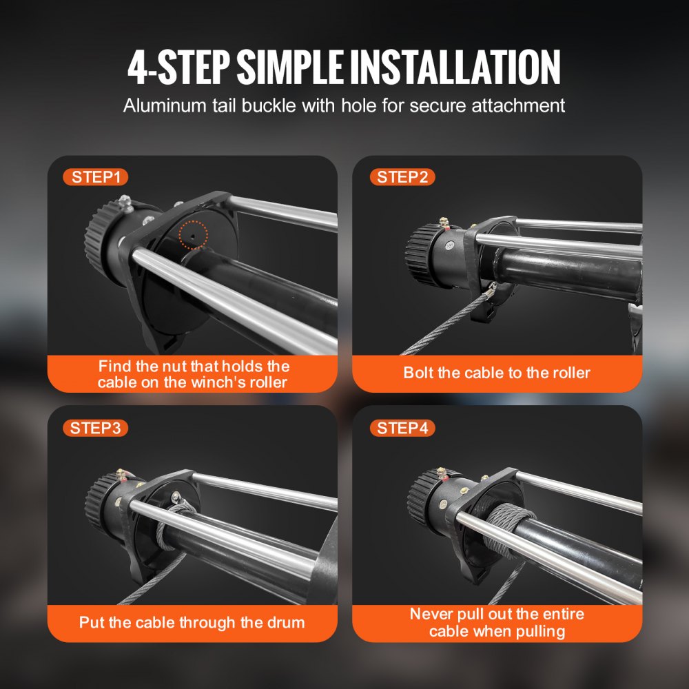 Łatwa instalacja: Instalacja jest banalnie prosta dzięki naszemu 4-etapowemu montażowi! Wystarczy przywiązać, nawlec i gotowe – ale unikaj wyrwania całej liny wyciągarki podczas użytkowania. Aby zapobiec przecięciu liny przez ostre krawędzie płyty prowadzącej, zalecamy zachowanie odstępu co najmniej 3/8 do 1/2 cala (ok. 9,7 cm) między otworem prowadzącym linę a krawędziami płyty montażowej.