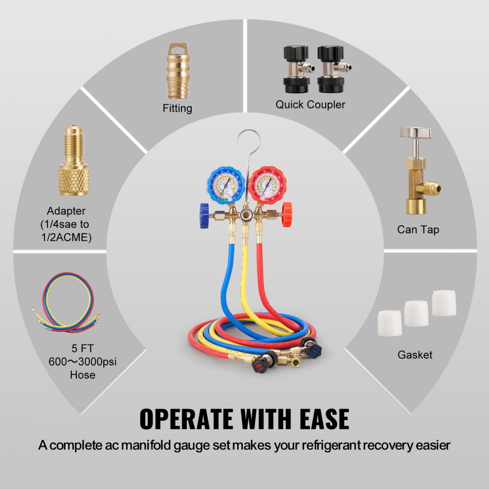 Zestaw manometrów do kolektora czynnika chłodniczego VEVOR, 3-drożny, R134A-R22-R12-R502, 4 szt., 5-stopowe węże do ładowania, manometr do kolektora czynnika chłodniczego, narzędzia diagnostyczne klimatyzacji samochodowej - Auto-moto