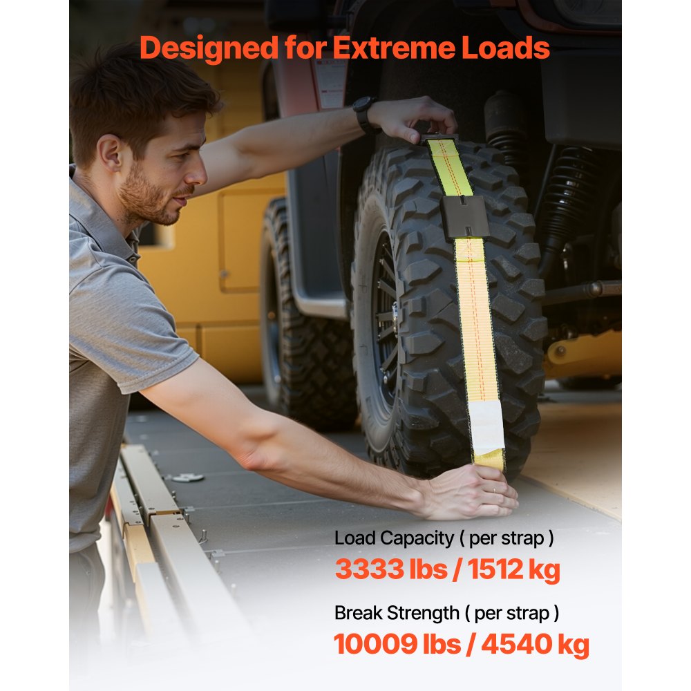 Zestaw pasów mocujących koła VEVOR (50,8 x 3048 mm) z hakami typu J, wytrzymałością na rozciąganie 4540 kg i ładownością 1512 kg, system mocowania motocykli, pas zabezpieczający koła, pas do opon do SUV-ów i przyczep, żółty