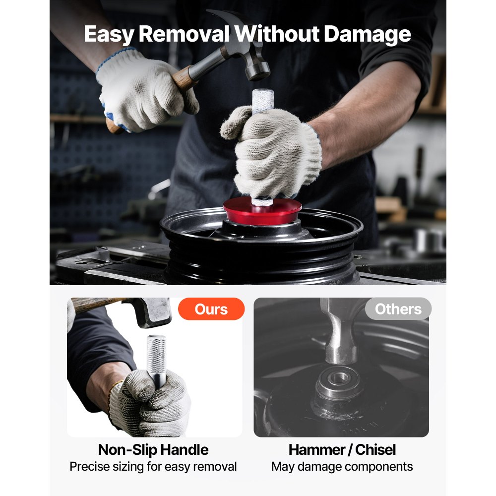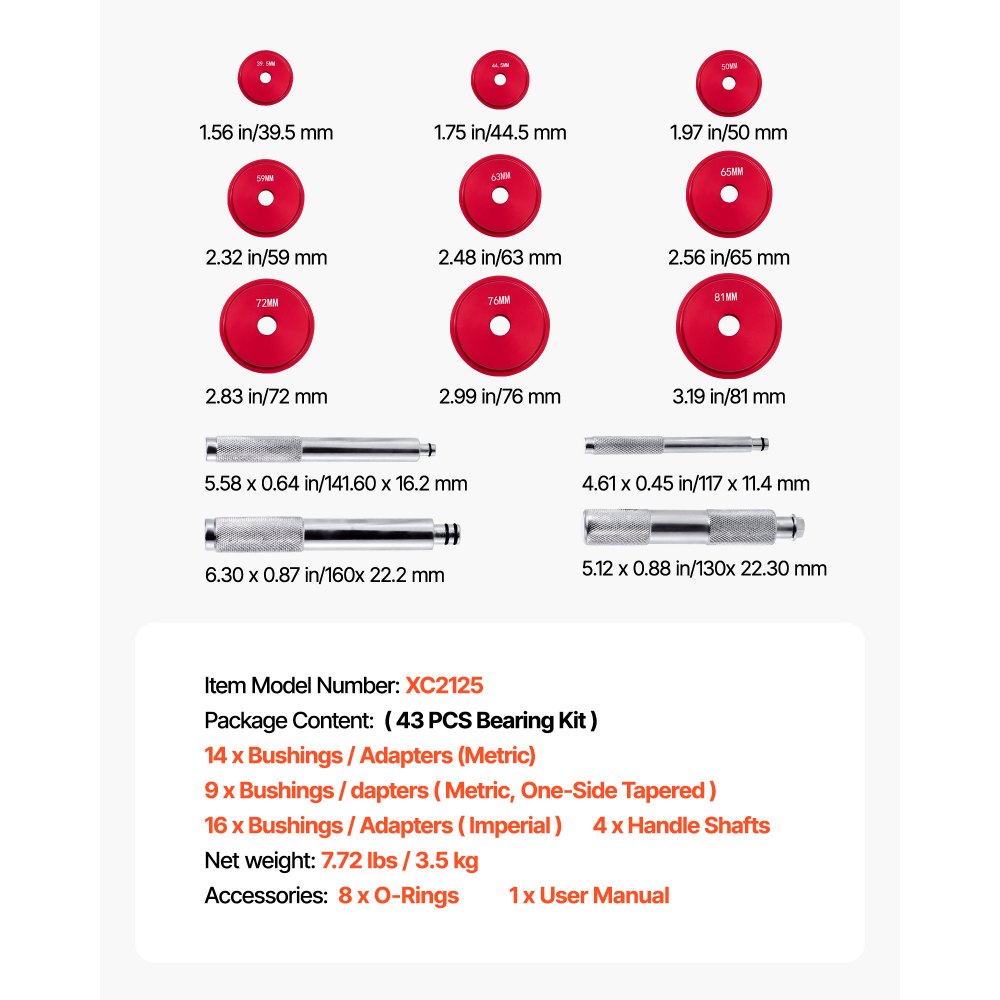 Szeroki wybór rozmiarów: Nasz zestaw pras do łożysk nadaje się do różnych zadań związanych z demontażem łożysk. Jest wyposażony w 43 powszechnie stosowane rozmiary tulei podkładkowych i szereg akcesoriów montażowych, tworząc kompletne narzędzie.