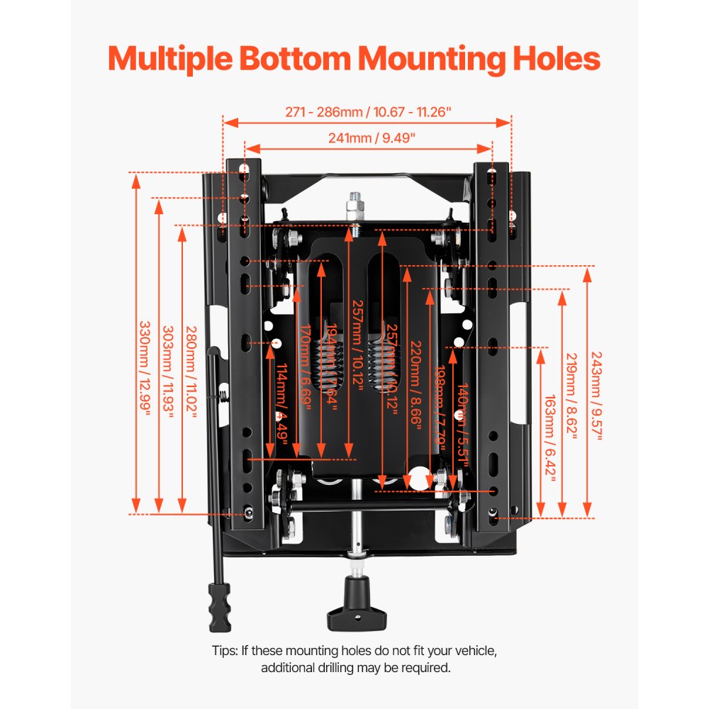 Wszechstronna kompatybilność: Wyposażony w 8 dodatkowych otworów montażowych zestaw zawieszenia fotela ciągnika pasuje do różnych maszyn, takich jak kosiarki do trawy, wózki widłowe, traktory i spychacze. Łatwa wymiana starych układów zawieszenia oraz poprawa stabilności i komfortu pracy.