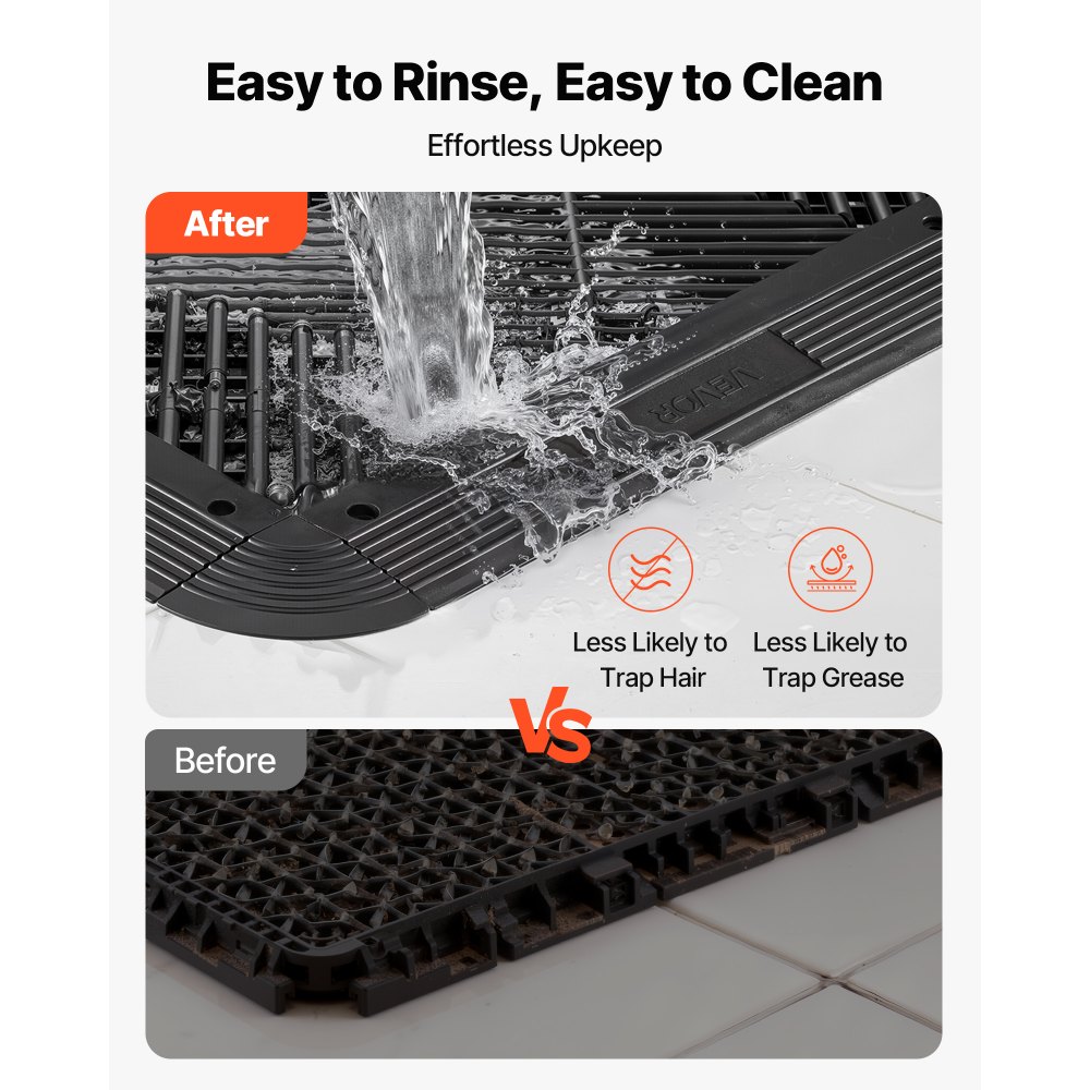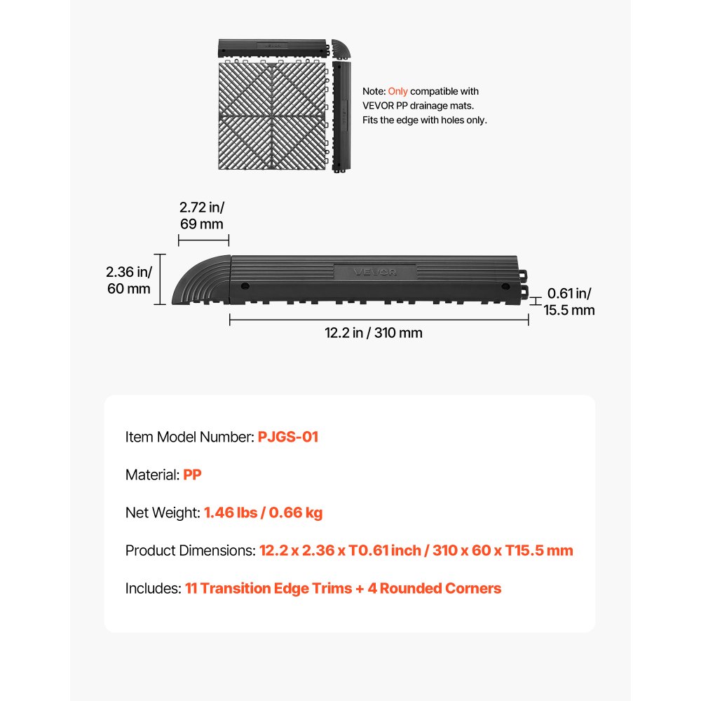 Szybki i łatwy montaż: Nie wymaga specjalnych narzędzi. Wystarczy wyrównać krawędź z kierunkiem maty i mocno docisnąć. Idealny do szybkiego montażu lub renowacji. Kompatybilny wyłącznie z matami drenażowymi VEVOR.