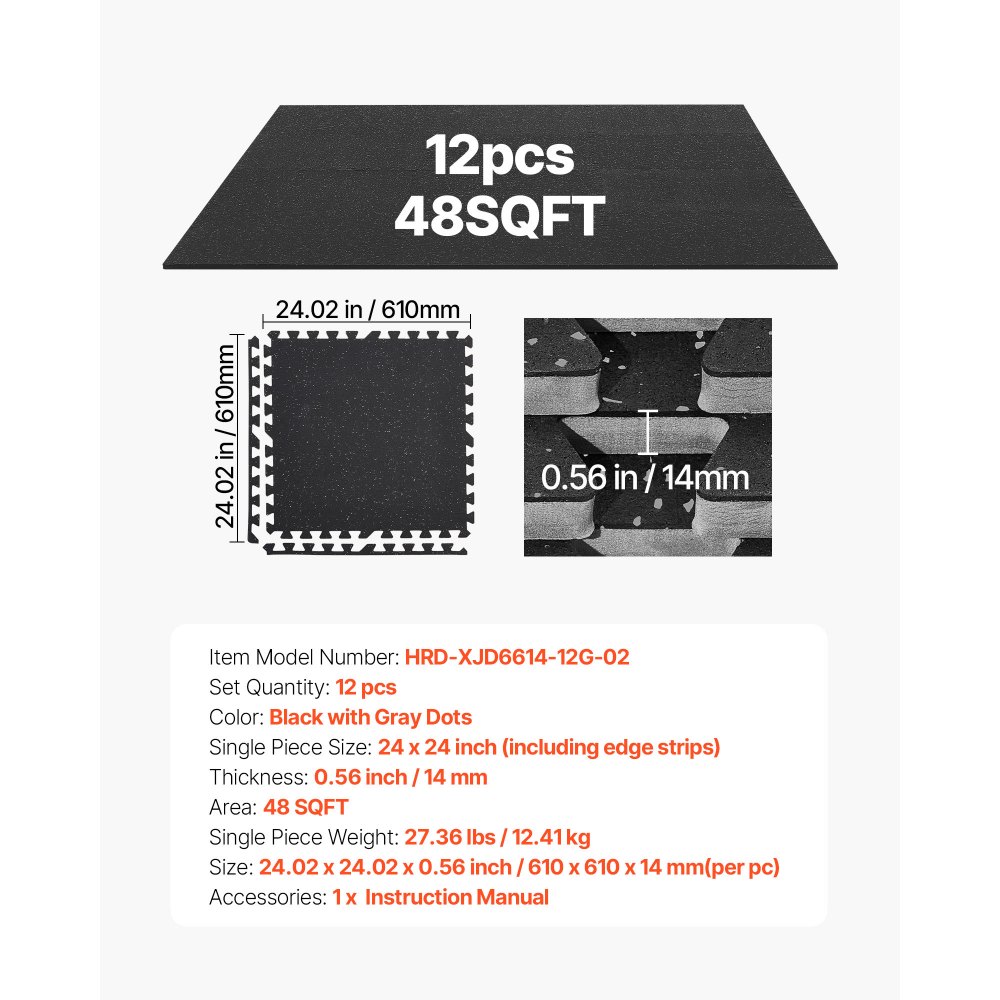 12 x Puzzle Mat Mat ochronna na podłogę 610 x 610 x 14 mm, mata z pianki EVA o wysokiej gęstości, mata fitness z blokadą, mata gimnastyczna, mata sportowa, mata treningowa (czarna) z szarymi kropkami - Budownictwo i konstrukcje | Galaxy Sklep