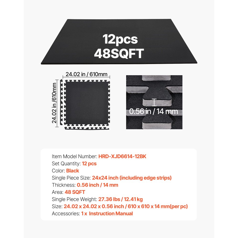 12 x Puzzle Mat Mat ochronna na podłogę 610 x 610 x 14 mm, mata z pianki EVA o wysokiej gęstości, mata fitness z możliwością łączenia, mata gimnastyczna, mata sportowa, mata treningowa, czarna mata do domowej siłowni
