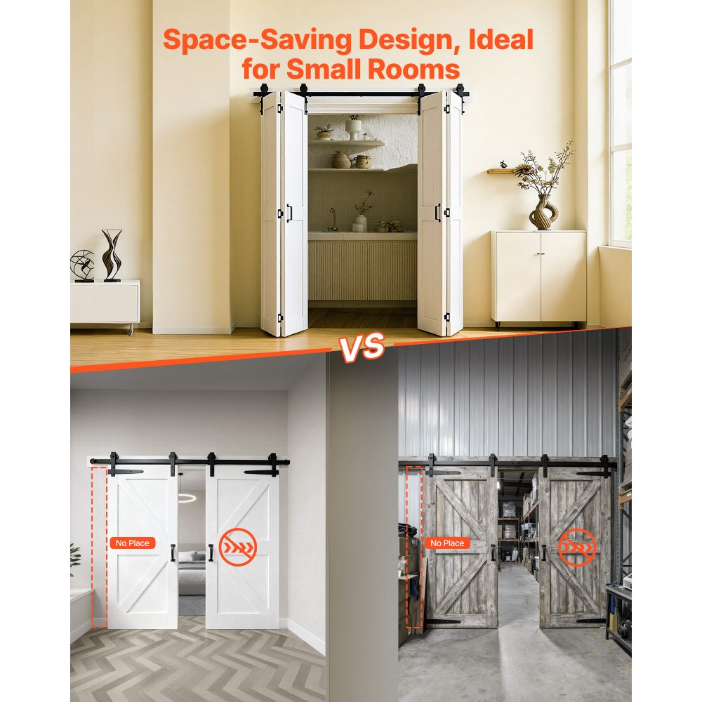 Oszczędność miejsca: Po otwarciu dwuskrzydłowych drzwi składanych w stylu stodoły, panele zsuwają się ze sobą, maksymalizując cenną przestrzeń na podłodze. To idealne rozwiązanie do wąskich przestrzeni i małych pomieszczeń.