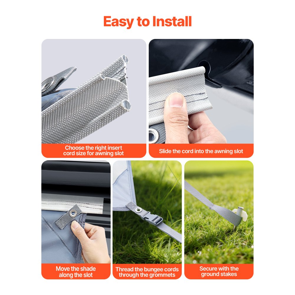 Trwała i niezawodna: Dzięki tkaninie poliestrowej o wysokiej gęstości, podwójnym szwom i czterem wzmocnionym narożnikom, ten przedni panel markizy do kamperów jest wyjątkowo odporny na rozdarcia i stabilny wymiarowo, zaprojektowany z myślą o długotrwałym użytkowaniu. W zestawie znajdują się cztery kotwy gruntowe zapewniające stabilną podstawę.