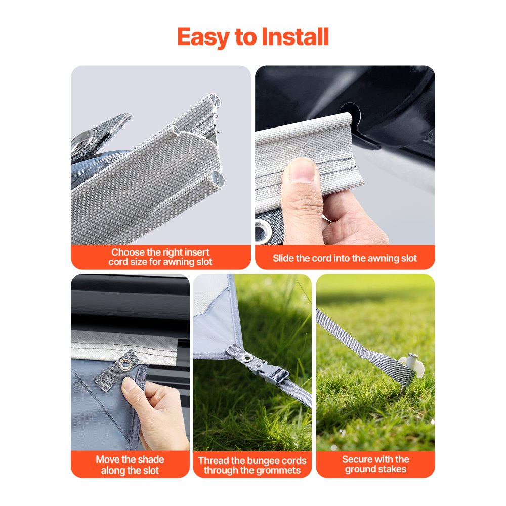 Trwała i niezawodna: Dzięki tkaninie poliestrowej o wysokiej gęstości, podwójnym szwom i czterem wzmocnionym narożnikom, ten przedni panel markizy do kamperów jest wyjątkowo odporny na rozdarcia i stabilny wymiarowo, zaprojektowany z myślą o długotrwałym użytkowaniu. W zestawie znajdują się cztery kotwy gruntowe zapewniające stabilną podstawę.
