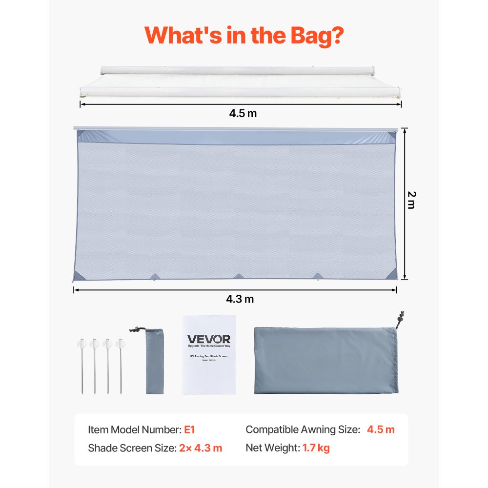 Wymiary: Siatka przeciwsłoneczna: 2 x 4,3 m, odpowiednia do markiz o szerokości 4,5 m. Przed zakupem należy dokładnie zmierzyć markizę, aby upewnić się, że będzie pasować.