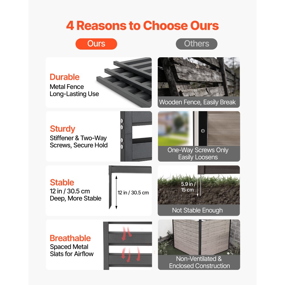 Solidna metalowa konstrukcja: Ta zewnętrzna ścianka działowa jest wykonana z wytrzymałego metalu i oferuje dłuższą żywotność niż osłony z drewna lub tworzywa sztucznego. Ocynkowana powierzchnia ogranicza kontakt z wodą deszczową, minimalizuje zużycie i gwarantuje niezawodne działanie nawet przy długotrwałym użytkowaniu na zewnątrz.