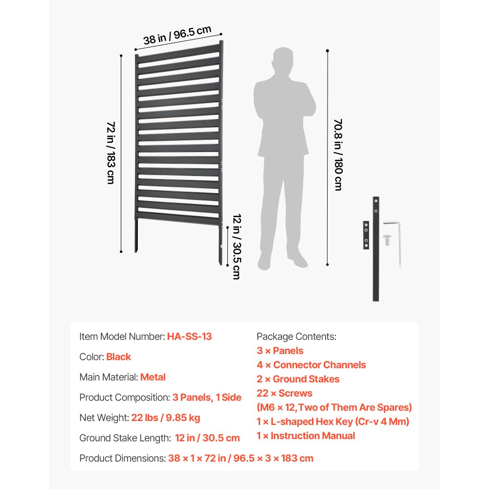 Parawan składany VEVOR 95,5 x 183 cm, metalowy parawan, ścianka działowa z kolcami do wbijania w ziemię, parawan zapewniający prywatność, parawan, dekoracyjna ściana zapewniająca prywatność, idealny do ogrodu, na taras, podwórko, balkon, czarny