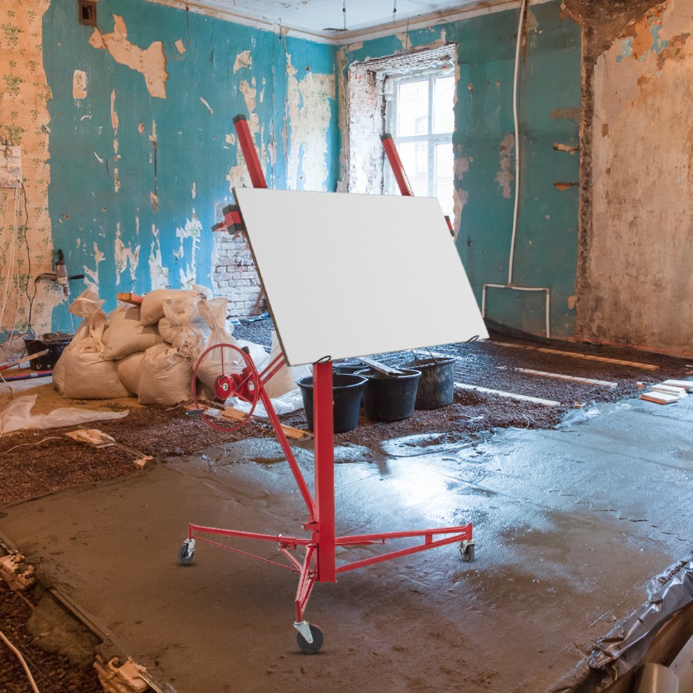 Łatwy w montażu i obsłudze: Podnośnik do płyt kartonowo-gipsowych można łatwo zmontować i zdemontować bez użycia narzędzi. Podnośnik posiada oszczędzającą pracę wciągarkę. Idealny do majsterkowania i użytku domowego, pozwala jednej osobie na samodzielny montaż płyt kartonowo-gipsowych lub desek podłogowych.