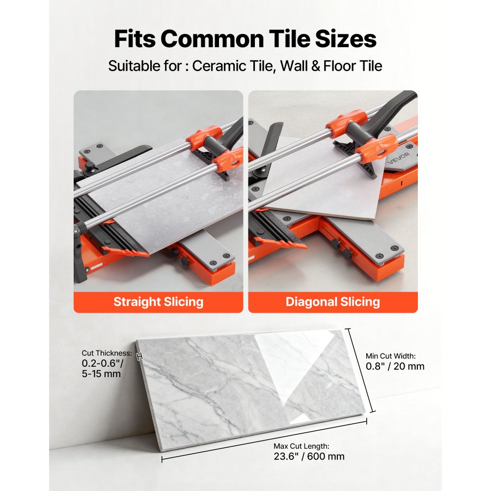 Obsługuje popularne formaty płytek: Przecinarka do płytek jest przeznaczona do cięcia prostego i ukośnego popularnych formatów. Nadaje się do cięcia ceramicznych płytek ściennych i podłogowych o maksymalnej długości cięcia 600 mm (24 cale), minimalnej szerokości cięcia 20 mm (0,8 cala) i grubości cięcia od 5 do 15 mm (0,2 do 0,6 cala).