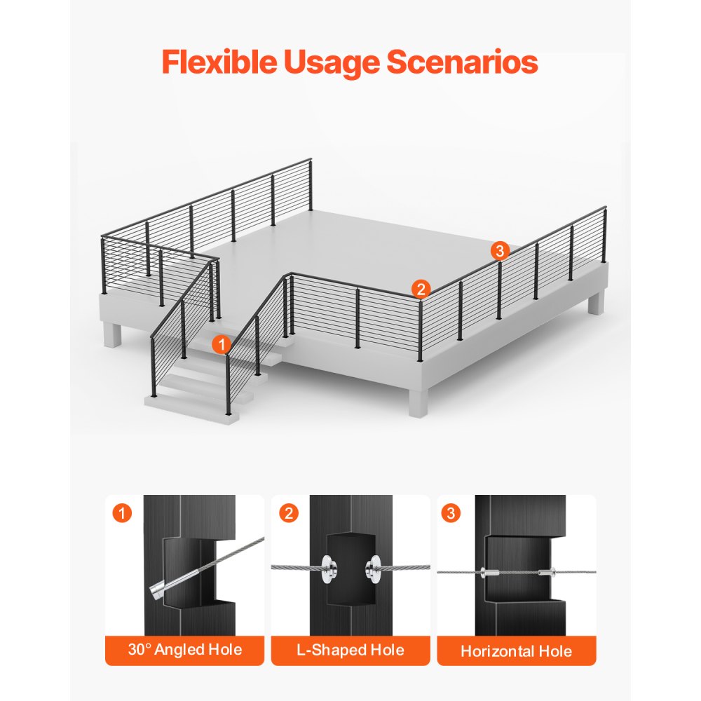 Ochrona w wielu miejscach: Nasze słupki do balustrad kablowych nadają się do ochrony wewnątrz i na zewnątrz, w tym tarasów, schodów, ganków, ogrodzeń, patio, balkonów, ogrodów, budynków mieszkalnych, biur komercyjnych, hoteli, garaży itp.