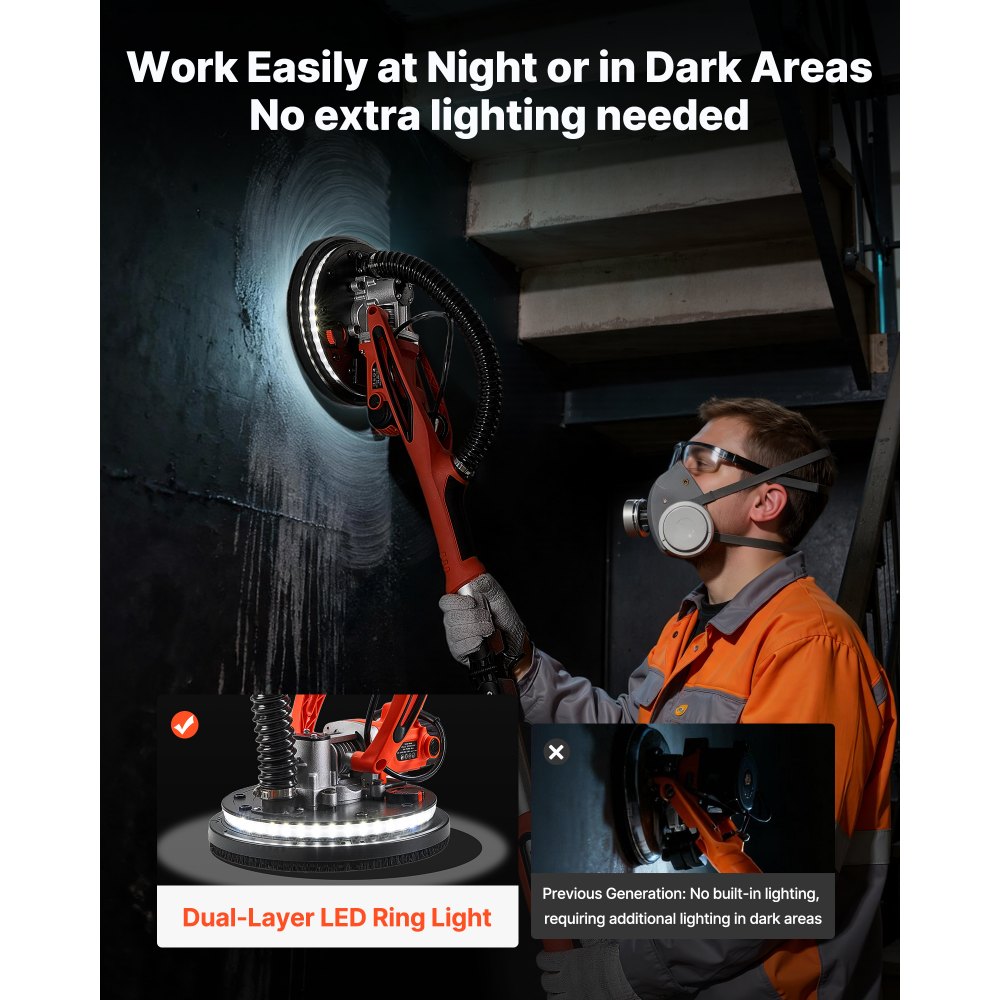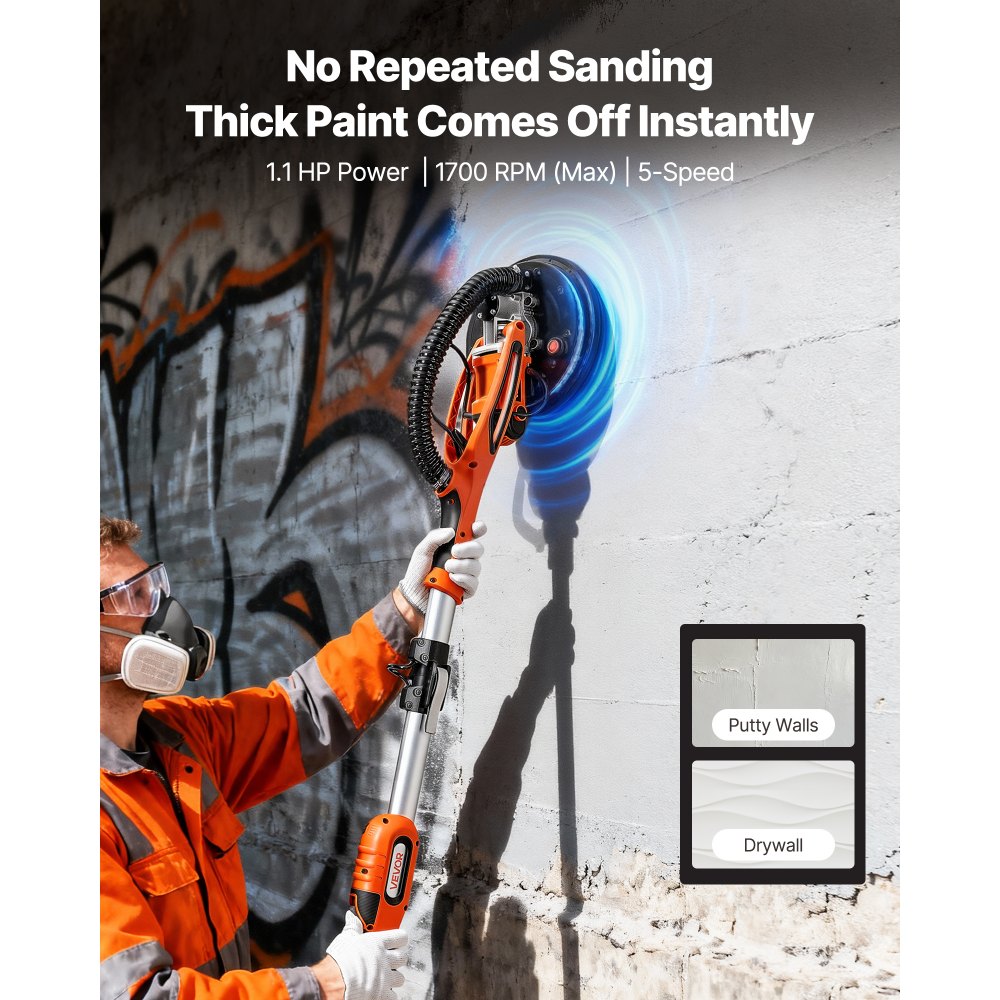 Szlifierka do płyt gipsowo-kartonowych VEVOR 850 W, szlifierka sufitowa z tarczą szlifierską 255 mm, szlifierka o długim zasięgu z prędkością 800–1700 obr./min, dioda LED z podwójnymi ściankami, wysuwana rękojeść, 15 tarcz szlifierskich, wąż do odsysania pyłu - Budownictwo i konstrukcje | Galaxy Sklep