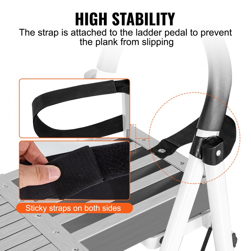 Nylonowe taśmy klejące: Twoje bezpieczeństwo jest zawsze naszym priorytetem. Dlatego aluminiowa deska posiada taśmę klejącą, która zapobiega zsuwaniu się z drabiny. Antypoślizgowa powierzchnia zwiększa tarcie, zapobiegając wypadkom.