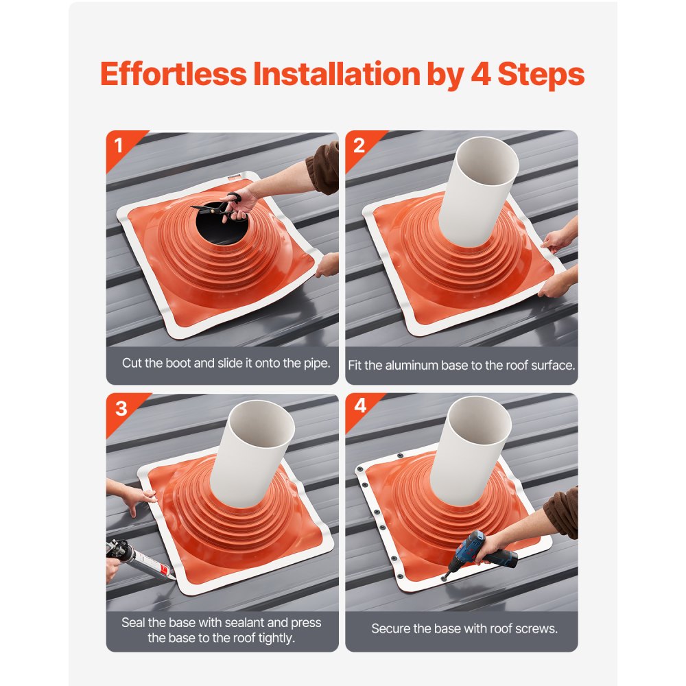 Wysokiej jakości silikonowa tuleja, trwała jakość: Dzięki zakresowi temperatur od -74°C do 225°C, nasza elastyczna tuleja wywietrznika dachowego jest wyjątkowo odporna na kwasy, korozję, utlenianie, deszcz, śnieg i promieniowanie UV. Jest odporna na pęknięcia i trwała. Tuleja ściśle przylega do rury i dachu, zapewniając doskonałe uszczelnienie i ochronę przed przeciekami.