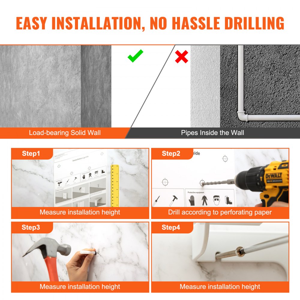 Montaż na ścianie za pomocą wywierconego otworu: Przemyślane wyposażenie w naklejkę z oznaczeniem otworu montażowego, umożliwiającą precyzyjne wiercenie – bez konieczności dodatkowego oznaczania długopisem. W komplecie z zaślepką na śruby, wkrętami ze stali nierdzewnej 304 oraz dodatkowym zestawem dwóch wkrętów ze stali nierdzewnej i zaślepek dla dodatkowej wygody. Uwaga: Zamontuj nasze składane siedzisko prysznicowe na nośnych ścianach litych.