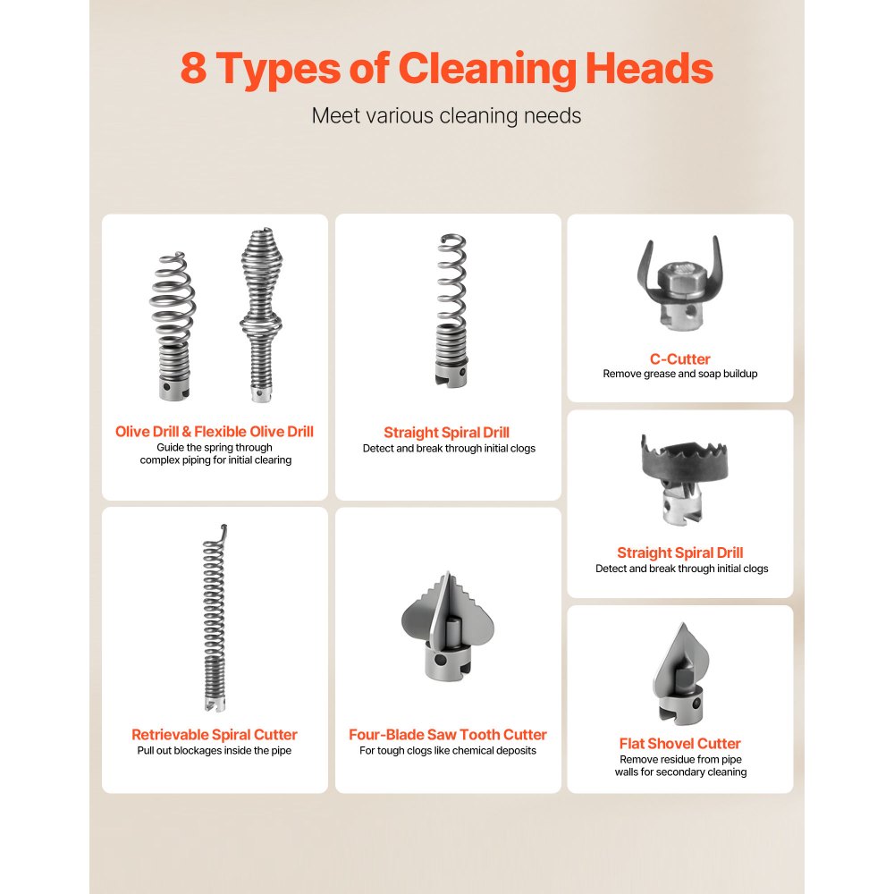 8 wymiennych głowic tnących: Wyposażone w wszechstronny zestaw głowic czyszczących, które można łatwo wymieniać, aby usuwać różnego rodzaju zatory. Od małych, codziennych zatorów po uporczywe zatory, nasze urządzenie do czyszczenia odpływów usuwa je szybko i skutecznie.