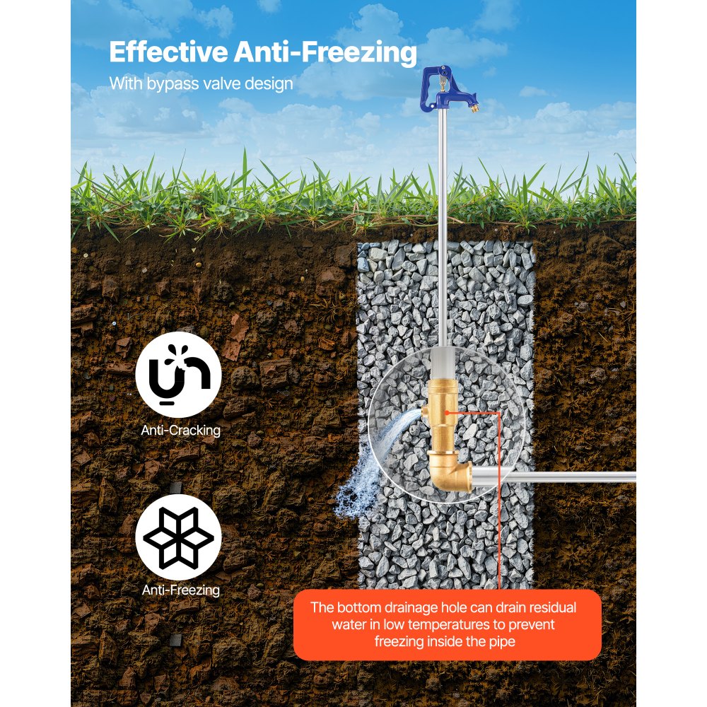 Zapewnij stałe zaopatrzenie w wodę: mrozoodporny hydrant ogrodowy VEVOR ma długość całkowitą 1280 mm i głębokość montażu 609,6 mm, co skutecznie chroni rury przed zamarzaniem. Idealny do nawadniania ogrodów, mycia samochodów, podlewania upraw rolnych i pielęgnacji trawników (niezalecany do wody pitnej).
