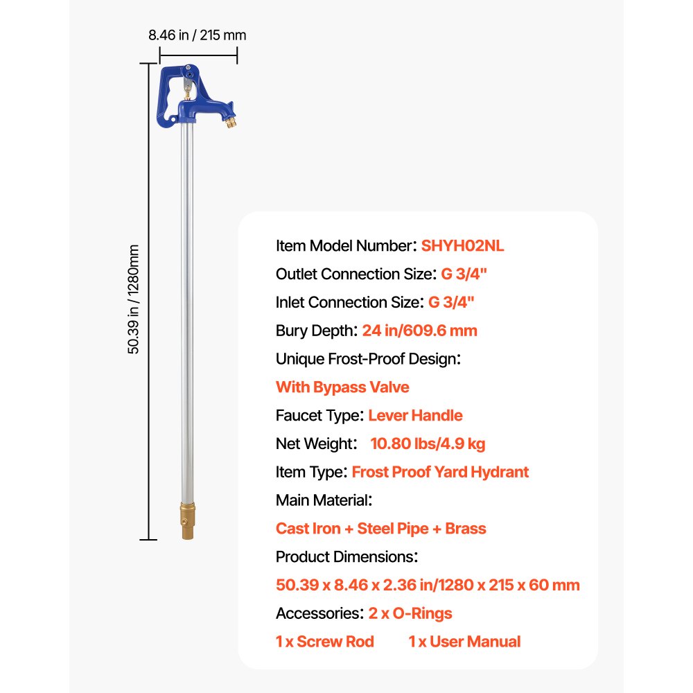 Hydrant ogrodowy VEVOR odporny na mróz, 1280 mm, kran zewnętrzny o głębokości zakopania 609,6 mm, przyłącze rurowe G 3/4 cala i złączka do węża, hydrant bezołowiowy do nawadniania ogrodu i gospodarstwa