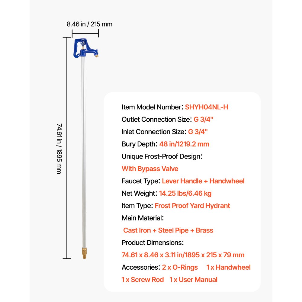 Hydrant ogrodowy VEVOR odporny na mróz, 1895 mm, kran zewnętrzny o głębokości zakopania 1219,2 mm, przyłącze rurowe G 3/4 cala, dźwignia + pokrętło, hydrant ogrodowy bez ołowiu do nawadniania ogrodu i gospodarstwa