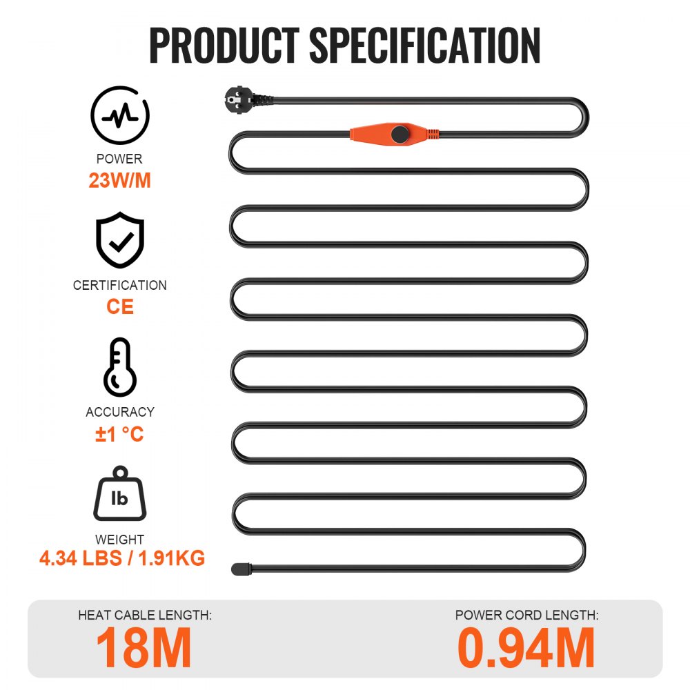 IDEALNA DŁUGOŚĆ: Nasz 18-metrowy przewód grzejny ma przewód zasilający o długości 0,94 m, co zapewnia dodatkową elastyczność. Ten kabel grzejny z rdzeniem grzejnym z włókna szklanego, izolacją z PVC, ekranami z oplotu z drutu miedzianego i płaszczem ochronnym z PVC zapewnia wysokie bezpieczeństwo i długotrwałe działanie w trudnych zimowych warunkach.