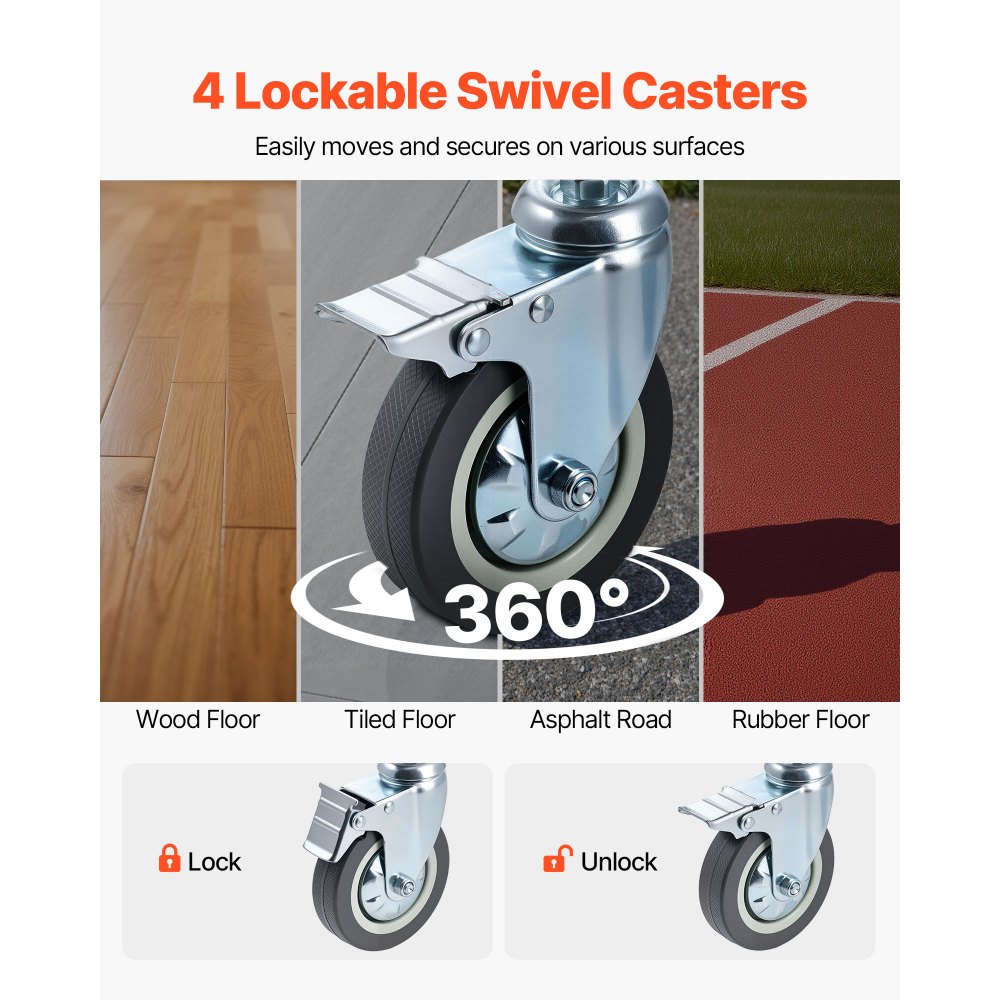 Krzesło toaletowe z funkcją rolki i blokady: Dzięki czterem kółkom o średnicy 3,9 cala i zakresie obrotu 360°, krzesło to zapewnia płynne przemieszczanie się po różnych powierzchniach. Każde koło posiada hamulec, który pozwala bezpiecznie zablokować krzesło w razie potrzeby – łatwe manewrowanie i stabilność.