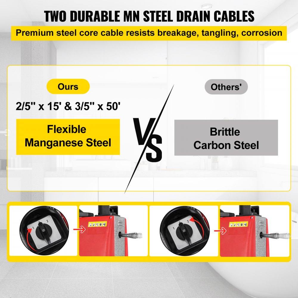 Trwała konstrukcja: Wykonany z solidnej, żelaznej ramy, ten udrażniacz do rur charakteryzuje się solidną konstrukcją i długą żywotnością. Posiada przenośny uchwyt ułatwiający transport i jest w stanie poradzić sobie z ciężkimi zadaniami czyszczenia, w tym czyszczeniem długich odcinków kanalizacji.