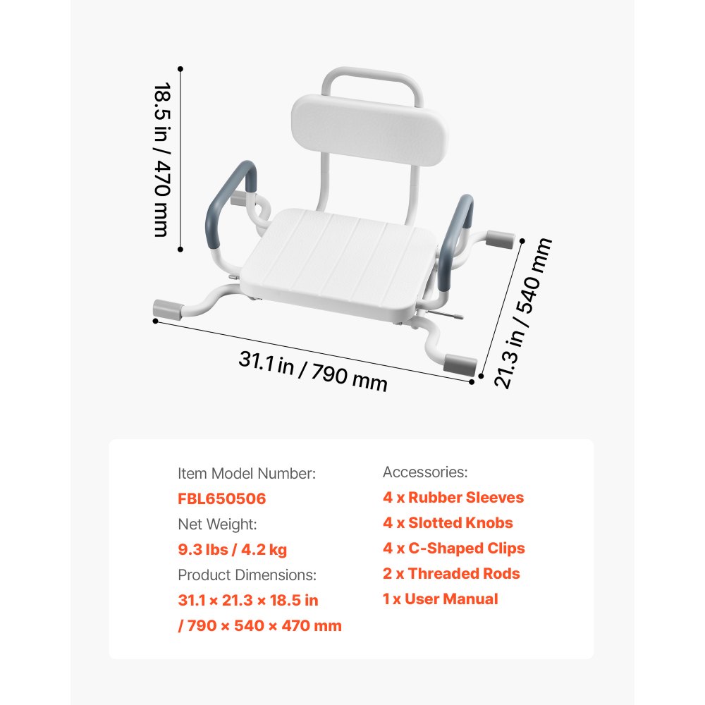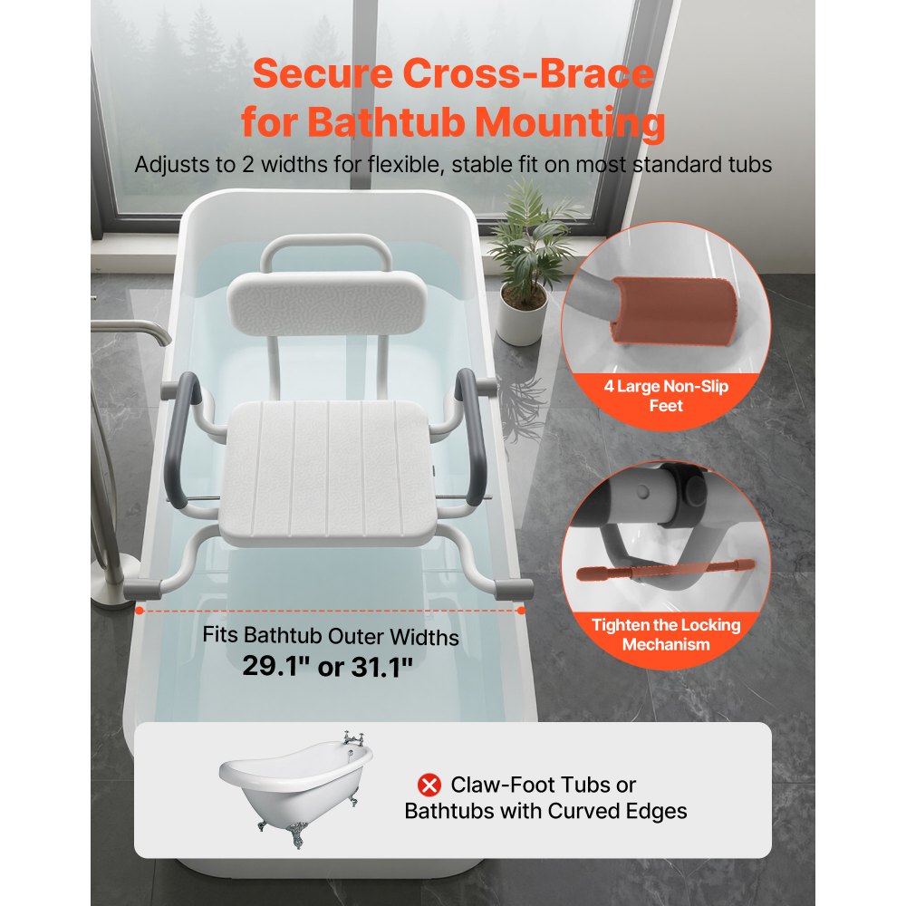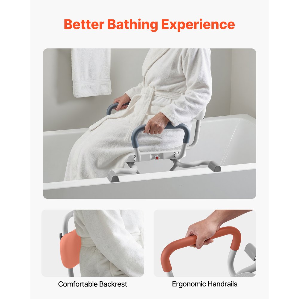 Antypoślizgowy uchwyt: Ta ławka do przenoszenia wanny wyposażona jest w cztery wyjątkowo duże, antypoślizgowe nóżki zapewniające niezawodną stabilność. Dwa zaciski pod siedziskiem dociskają do ściany wanny, a podłokietniki zapewniają wsparcie podczas siadania i wstawania.