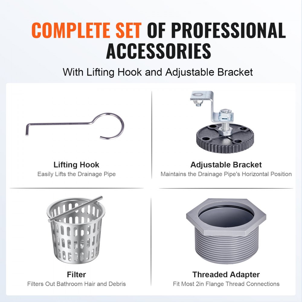 Dołączone akcesoria: Aby umożliwić wygodną instalację, produkt jest dostarczany z pełnym zestawem akcesoriów, obejmującym hak podnoszący, regulowany uchwyt, filtr i adapter gwintowany.